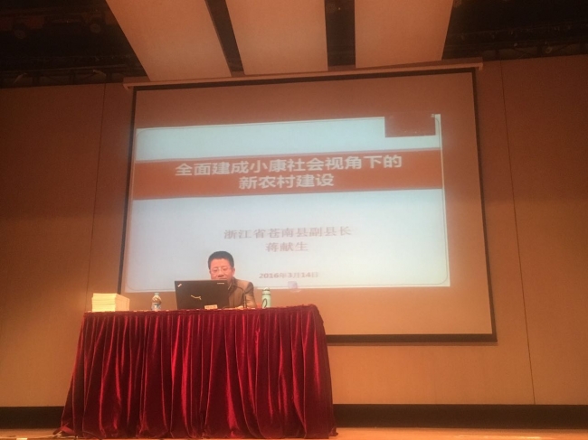 三是理论结合实际,提出苍南县三农工作的思路。蒋献生结合自己多年的地方基层三农工作经验,介绍了苍南县在三农工作中的有效实践,提出要坚持创新、协调、绿色、开放、共享的五大发展理念,围绕建设美丽苍南的目标,推进农村产权制度和支农财政体制的综合改革,突出提升发展能力、搭建发展平台、优化发展环境的三大任务,确保粮食、农产品和防汛等安全,打好农村生活污水治理等五场硬仗。