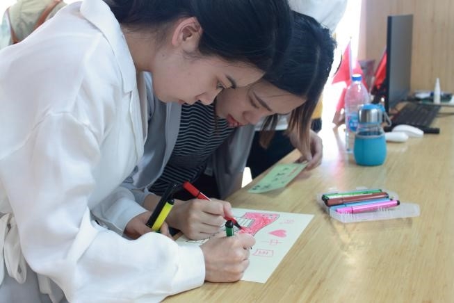 活动的最后环节是手抄报和小卡片设计,围绕“我与祖国的七十年之约”和对祖国的深切寄语,四组同学纷纷摩拳擦掌,经过一段时间的集思广益和争分夺秒的创作,最后呈现出一幅幅精彩绝伦的画作和一句句动人心弦的话语,现场谱写了一曲热爱祖国的青春赞歌!