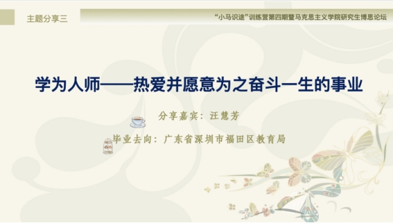 汪慧芳同学主要从自己选择当老师的初心、应聘过程和经验等方面进行了教师岗就业经历分享。首先,成为一名教师一方面是自己以前出身师范,从了解教育教学知识、手持相关的证书、自身的性格特点等分析了自身的从业优势,但更重要的是自己对教师这个职业的热爱和向往。其次,分享了自己的求职经历,主要包括参加宣讲会、招聘会、提交信息材料(一定要准备充分、详细)、现场面试、签协议和体检等五个方面。在准备教师岗求职之前,应该要有教师相关的知识储备,最好可以有教师相关证件材料和教师实习经历,会为自己的求职加分。另外,求职机会很多,不要因为一次挫折就气馁,要多面试多挑战。最后,在面试过程中,最重要的是有自信,给面试官一个好印象非常重要,要脚踏实地多学多练,拥有阳光自信的态度你就成功了一半!