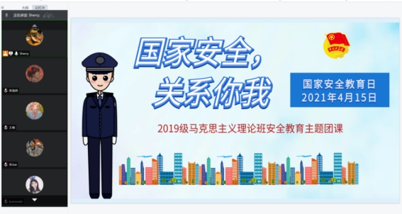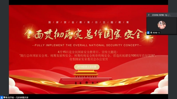4月15日下午,2019级本科团支部全体同学于线上开展了国家安全感教育专题团课,集体观看了“千万师生同上一堂国家安全教育课”学习讲座。观看讲座之前,首先由班长曹宇轩介绍了国家安全教育日的设立、国家安全的内容和大学生开展国家安全教育的学习意义。接下来同学们集体观看了国家安全教育讲座,由三位主讲人讲述国家安全的内涵意义和重要性,同学们也在观看完毕后发表了学习感想。