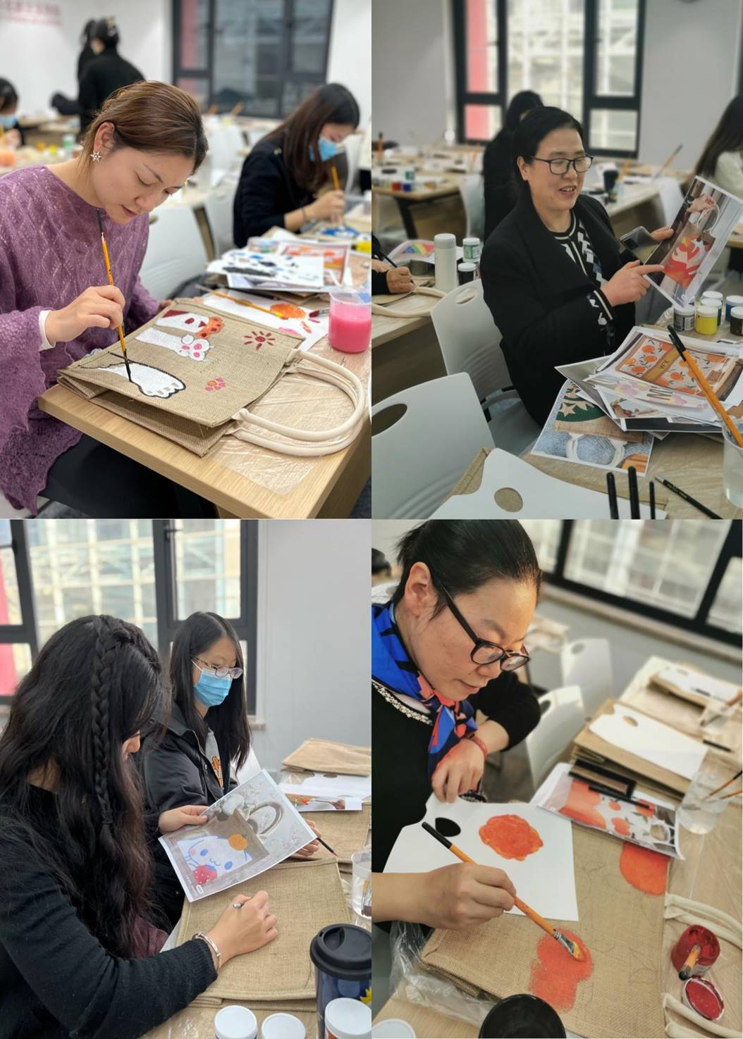 活动开始,指导老师详细介绍了手绘帆布包的注意事项和绘图技巧,并展示了活动的所需材料。老师们挑选并设计了各自的专属图案,用绘图笔描绘勾勒图案边线,以烯颜料调出深浅不一的手绘配色,再上色勾边静待风干。在热烈交流和相互协作中,一幅幅生动的画作跃然于包上,或活泼明媚,或典雅别致,为大家带来了创作的艺术乐趣。